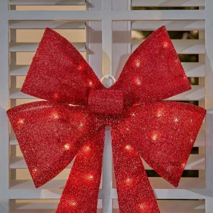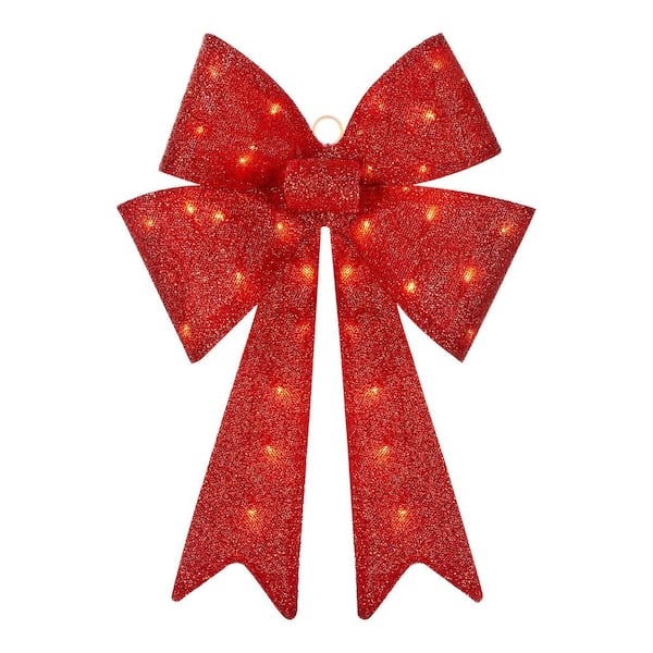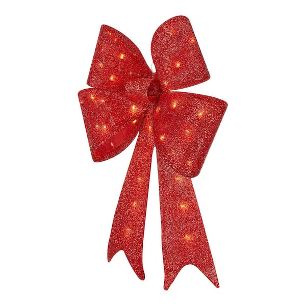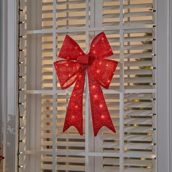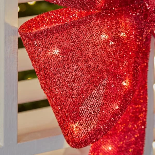 Create a festive Christmas display with this 24 in. Yuletide Lane LED Red Tinsel Bow from Home Accents Holiday. This bow is suitable for indoor or outdoor use. It has 35 warm white mini LED lights. It plugs into a standard outlet for flexible placement. Suction Cups, Spare Bulbs, and Fuses included. It's the perfect yard decoration for your home, front porch, or yard. Pair with other Yuletide Lane holiday items.