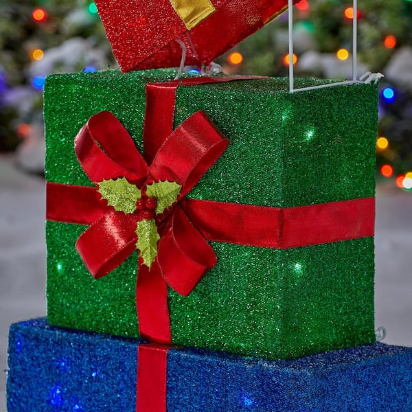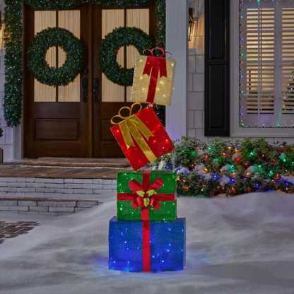 Create a festive Christmas display with this 4.5 ft. Yuletide Lane LED Stacked Gift Boxes from Home Accents Holiday. This gift box stack is suitable for indoor or outdoor use. It has 90 multi-colored LED lights and a durable pre-wired metal frame. It plugs into a standard outlet for flexible placement. Ground stakes, spare bulbs and fuses are included. It's the perfect yard decoration for your home, front porch, or yard. Pair with other Yuletide Lane holiday items.