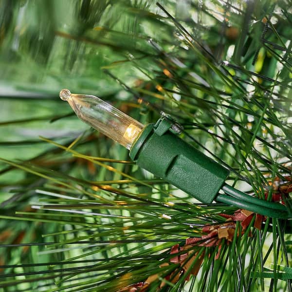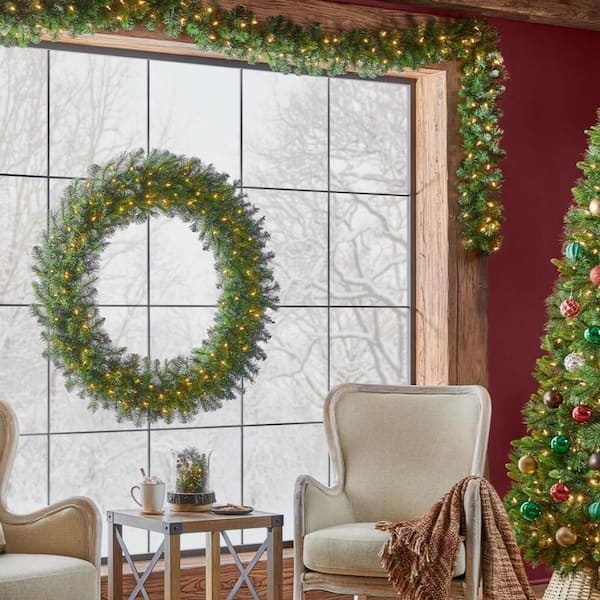 Get into the holiday spirit with this 48 in. Wesley Long Needle Pine LED Pre-Lit Artificial Christmas Wreath from Home Accents Holiday. It features 366 branch tips and 120 mini warm white energy-efficient LEDs. This wreath plugs into a standard electrical outlet for consistent power and is ready to light up your space this holiday season.