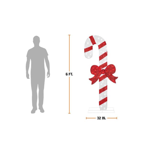 Create a festive Christmas display with this 6 ft. Icicle Shimmer Twinkling LED Candy Cane with Red Bow from Home Accents Holiday. This candy cane is suitable for indoor or outdoor use. It has 50 cool white and 20 red LED lights. Features a durable pre-wired metal frame. It plugs into a standard outlet for flexible placement. Ground stakes, spare bulbs and fuses are included. It's the perfect yard decoration for your home, front porch, or yard. Pair with other Icicle Shimmer holiday items.