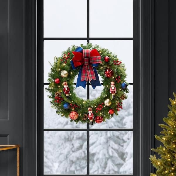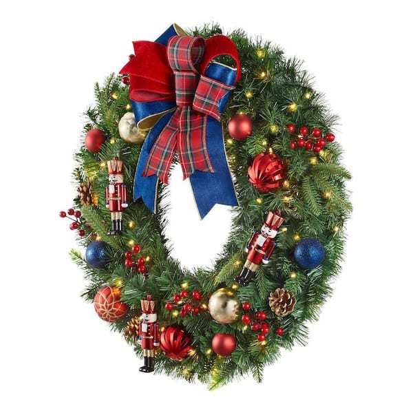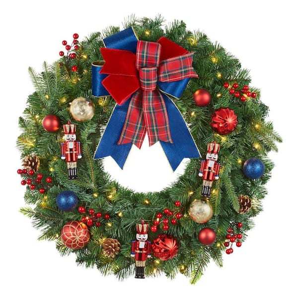 Welcome the holidays with the 30 in. Pre-Lit LED Artificial Christmas Wreath, a festive centerpiece that blends traditional charm with modern sparkle. This Noble Fir wreath, adorned with a delightful nutcracker, ornaments, berries, and pine cones, captures the essence of Christmas decorating ideas. The rich blue and red bow adds a striking touch, complementing the warm, clear LED lights that create a cozy ambiance. Battery-powered with a built-in timer, this wreath offers the flexibility to decorate for Christmas both indoors and in covered outdoor spaces without unsightly cords. Crafted by Home Decorators Collection, known for quality decor for Christmas, this decorated wreath brings the magic of the season to your doorstep, making it a perfect addition to your diy Christmas decorations.