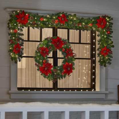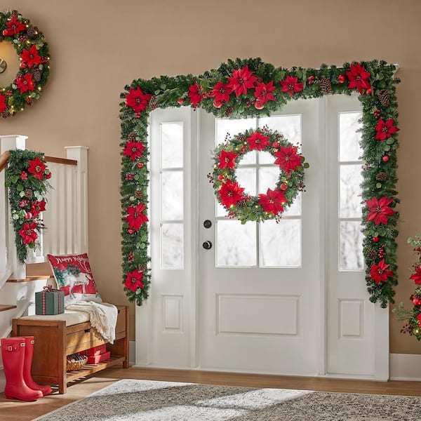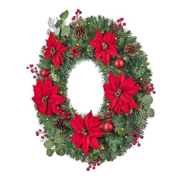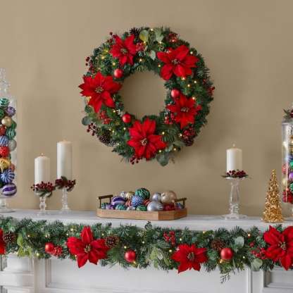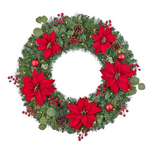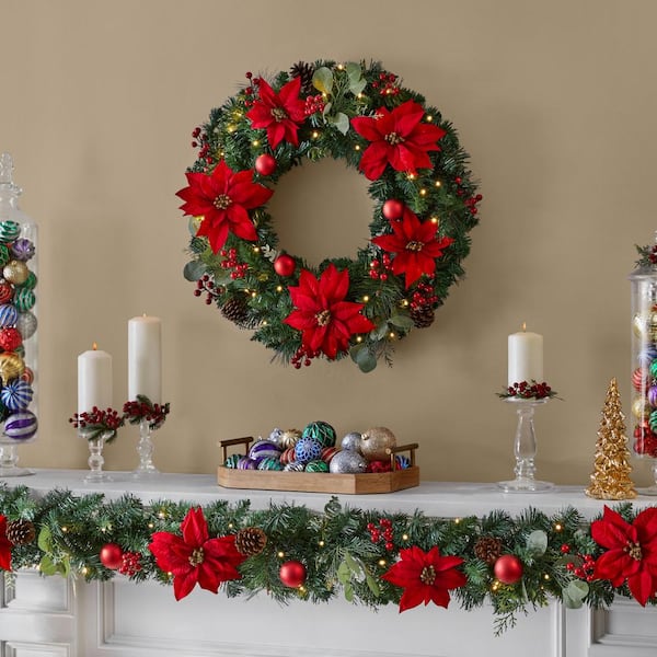 Add holiday cheer to your mantel or stairway railing with this 30-in. prelit Berry Bliss Christmas wreath. Colorful poinsettias, ornaments, pine cones and berries help you bring vintage Christmas style to your decor. For a soft winter glow, it comes with 50 warm LEDs.