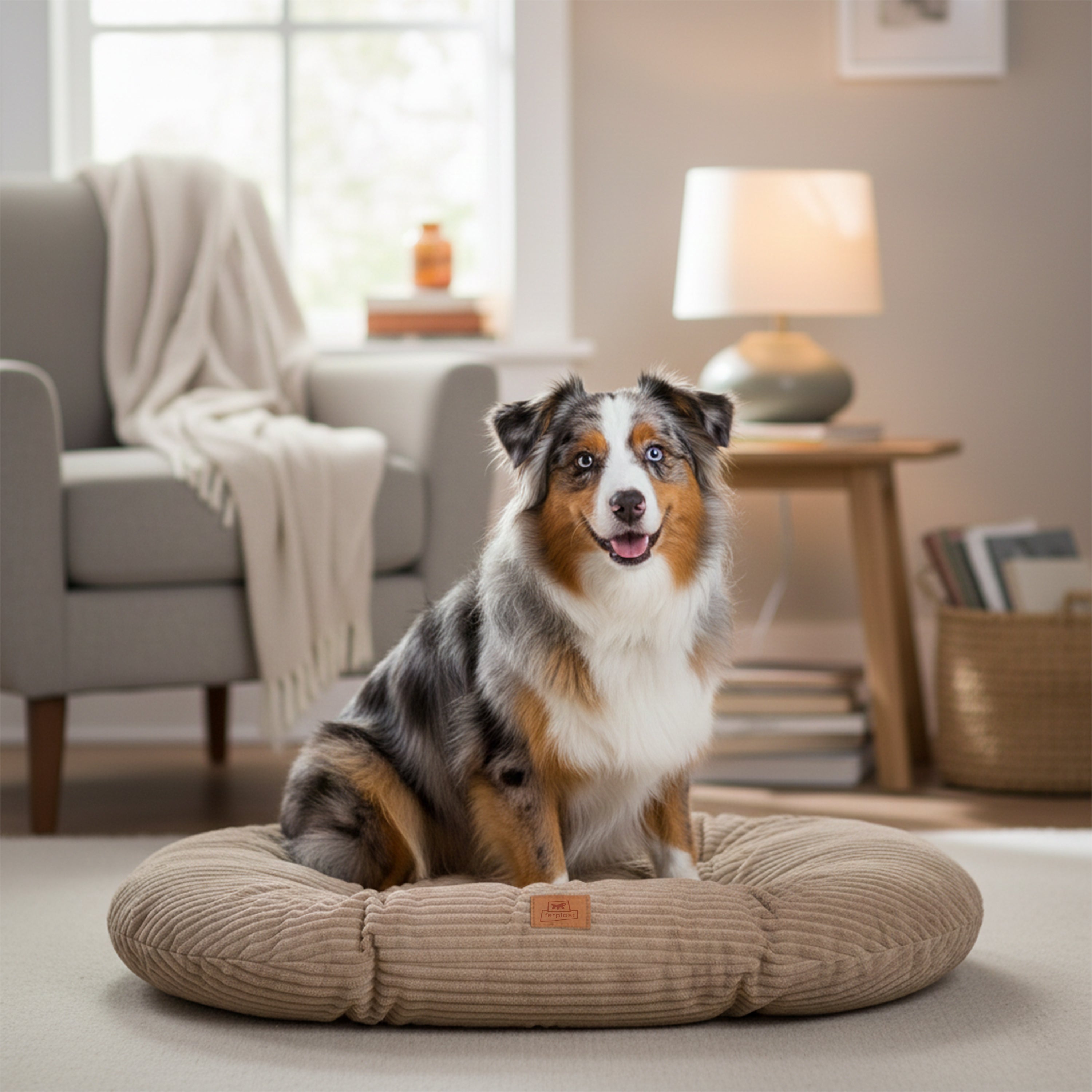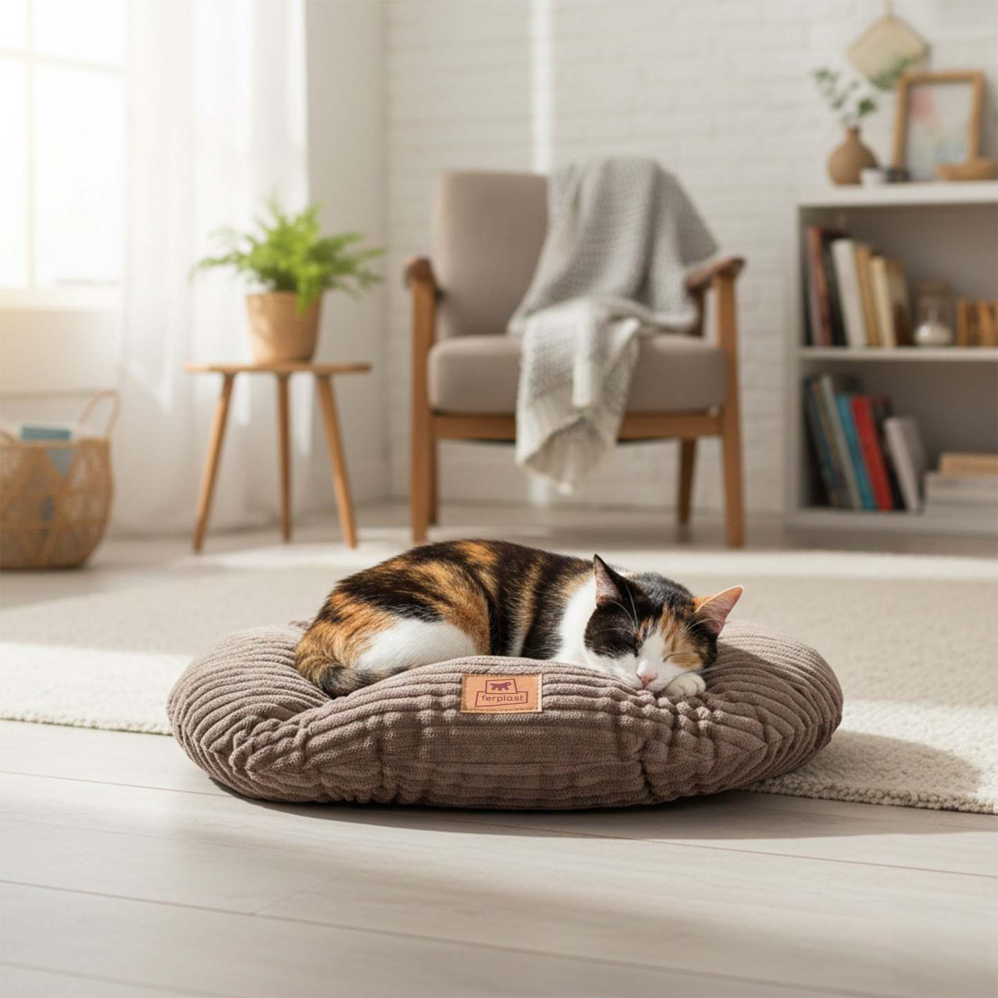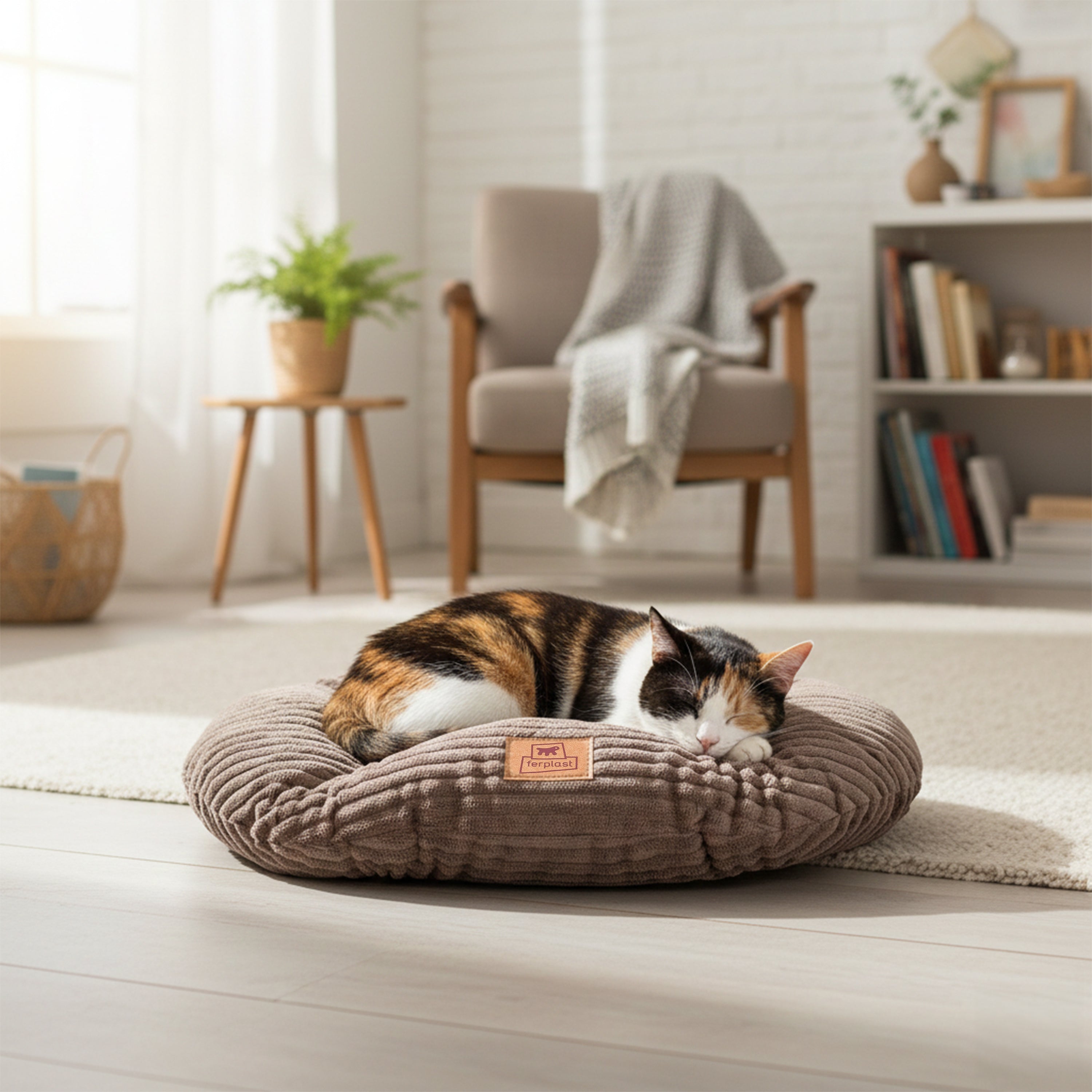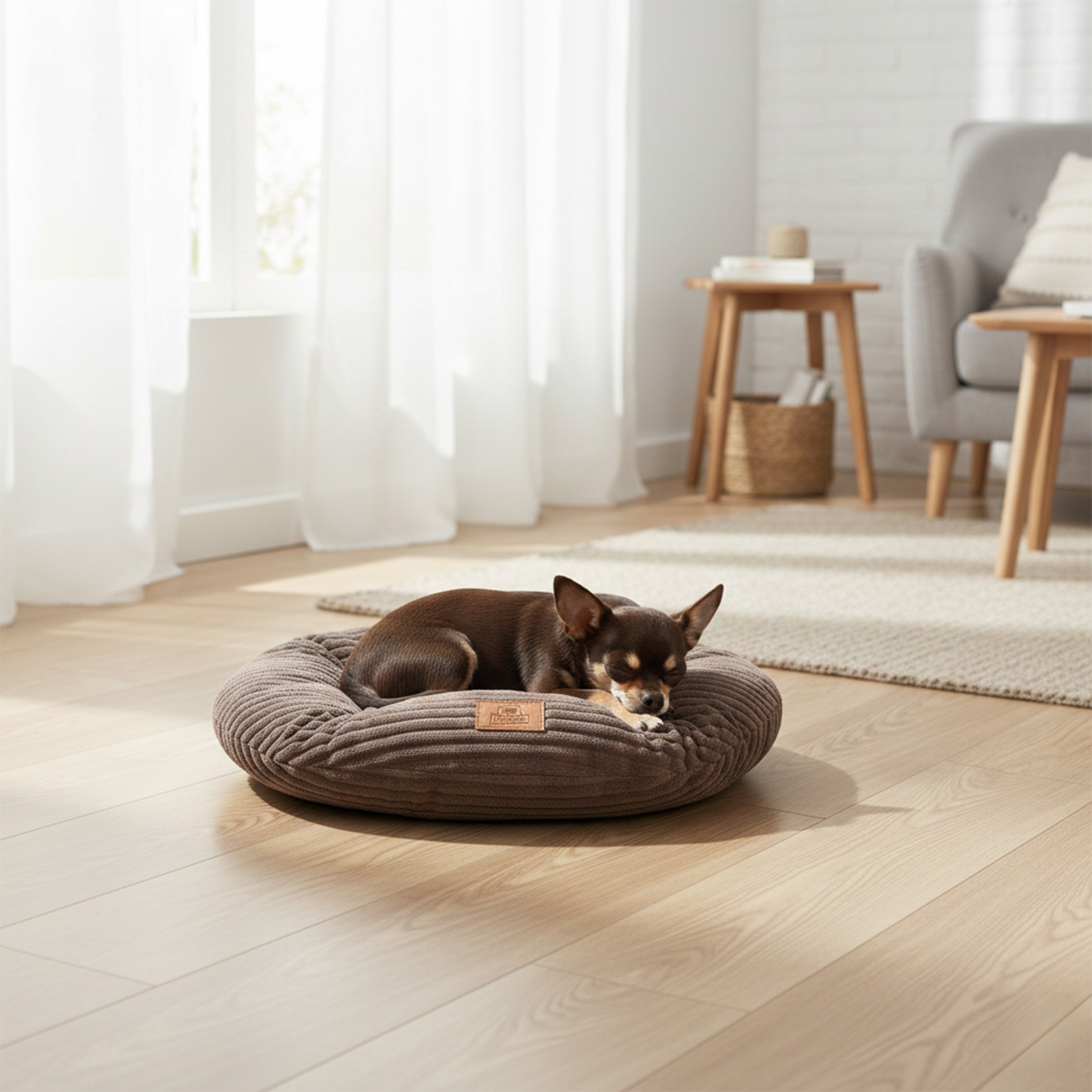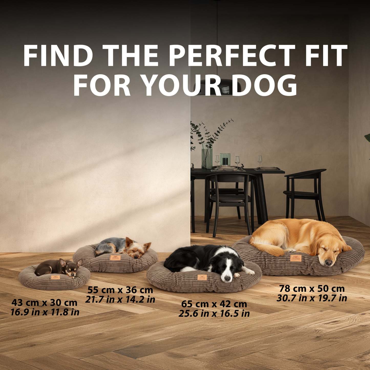 Le coussin Relax Corduroy est conçu pour les chiens et les chats. Il offre un espace de repos doux, confortable et fonctionnel. Sa forme ovale ergonomique soutient naturellement le corps de l'animal, favorisant une position de repos détendue et confortable.